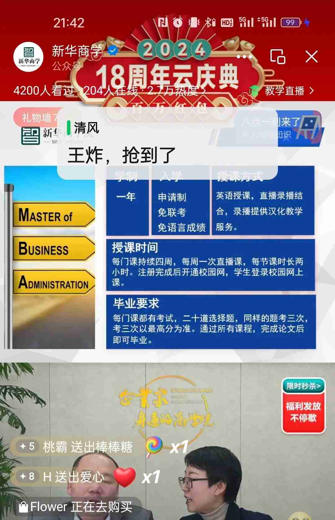 在新老同学的祝福声中,本次直播活动圆满结束。新华商学院走过了18年的历程,我们要再次向每一位支持和信任我们的新老同学表示衷心的感谢。你们的积极参与和热情支持是我们前进的动力,也是我们追求卓越的不竭源泉。