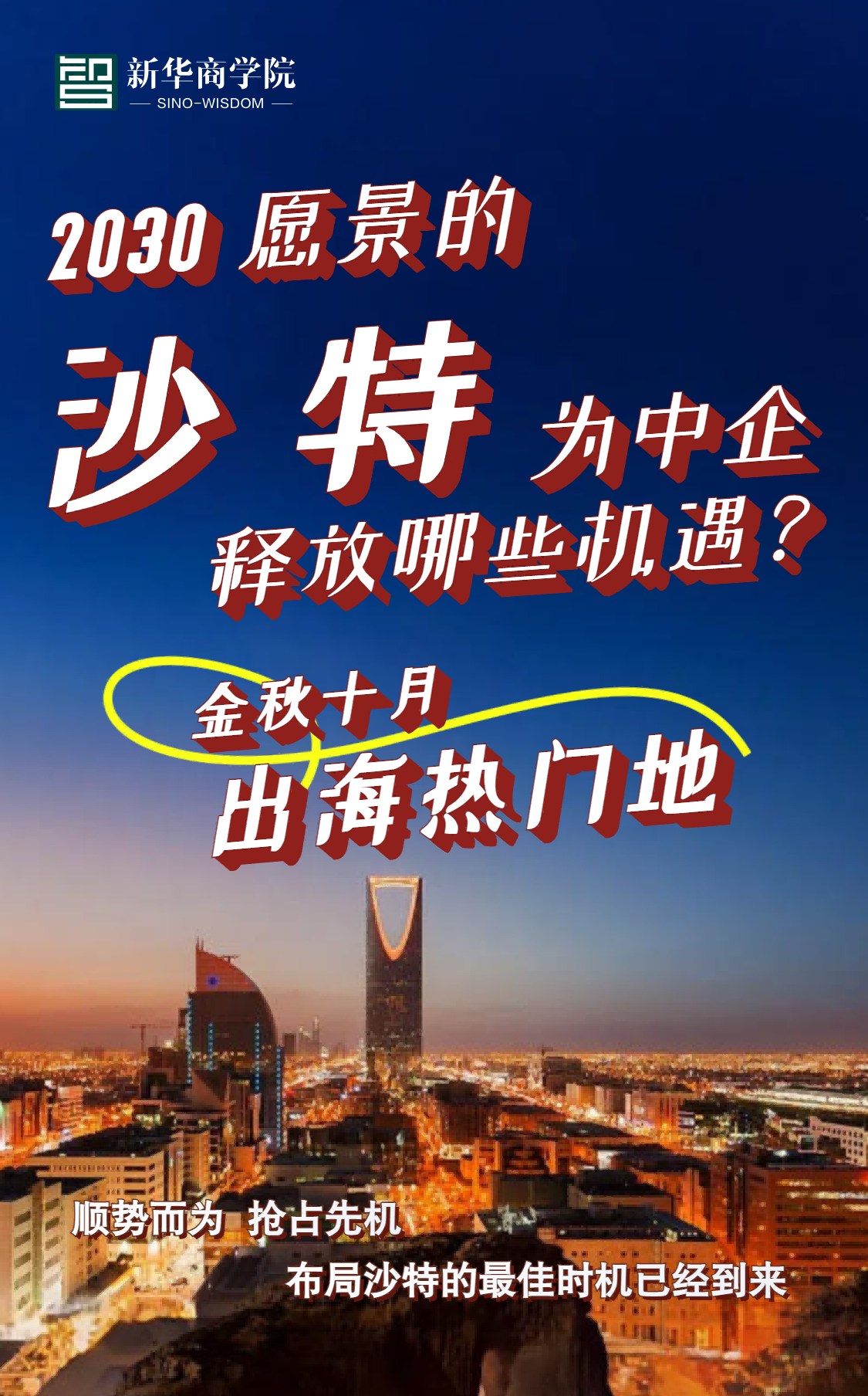 为了帮助新航海者提升全球化认知、掌握全球化运营能力,新华商学院将于10月12日--18日带领大家走进沙特,与沙特政府部委与单位、沙特本土著名企业、中国企业代表等进行面对面交流,实地走访行业龙头企业、重点项目,深入了解沙特的市场需求和潜力,为中资企业未来的发展方向提供宝贵的参考!
